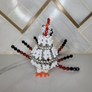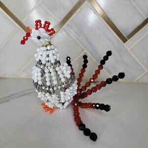 This handcrafted beaded rooster figurine is a stunning example of intricate craftsmanship. Made from a combination of wire and beads, this decorative art piece showcases vibrant colors and meticulous detailing. It can serve as a unique centerpiece or an eye-catching addition to any collection of artisan crafts.