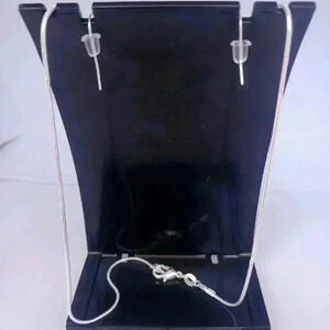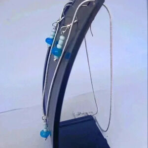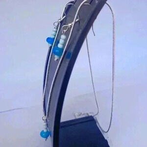 This is a handcrafted, beautifully beaded charm on an 18-inch silver necklace fit with a lobster claw and accompanied by a matching pair of 925 stamped dangle hook earrings that are fit with rubber backings. Made in Key Largo, Florida.