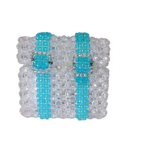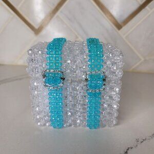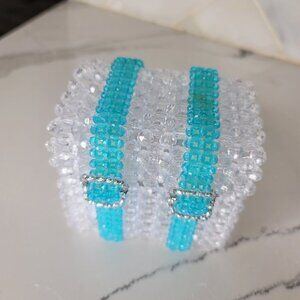 This meticulously handcrafted beaded jewelry box showcases a beautiful combination of clear and turquoise beads, creating a sparkling and elegant design. The intricate beadwork highlights the craftsmanship involved, making it an exquisite piece for storing your precious trinkets. Ideal for adorning any vanity or dresser, this decorative box is both functional and visually appealing.