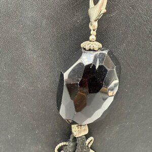 Handcrafted Black Beaded Long Pendant Necklace With Leather Cord & Silver Accent