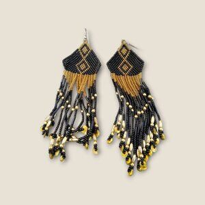 Handcrafted Black & Gold Beaded Fringe Earrings With Tribal Diamond Pattern