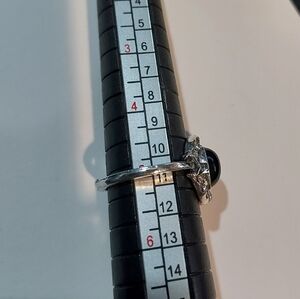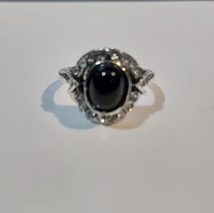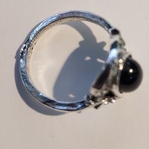 Handcrafted alloy ring with black stone and rhinestone . This is a size 5, I used it as a pinky ring. This is handcrafted, so there are flaws in the alloy band. The band is smooth so it's not poking or scratching, but you can see some flaws. I tried to capture in the photos. Unique ring.