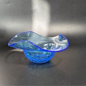 A beautifully handcrafted blue crackle glass bowl, perfect as a decorative centerpiece or functional dish. Its unique flared rim adds elegance and sophistication.