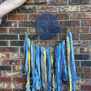 Enhance your home decor with this stunning handcrafted dreamcatcher. Featuring a beautiful blue design with vibrant yellow accents, it adds a touch of elegance to any room.