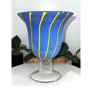 Handcrafted blown art glass vase with striking blue and yellow striped design. Perfect decorative piece for flowers or as a standalone accent. Measures approx. 7 3/4” tall x 6 1/2” wide.