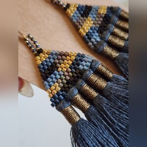 Elegant handcrafted earrings featuring a stunning combination of blue and gold beads with a tassel design. Perfect for adding a touch of sophistication to any outfit.