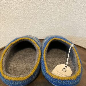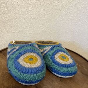 Experience comfort with these handcrafted wool slippers. Featuring a vibrant blue and green design, these slippers are perfect for cozy days at home.