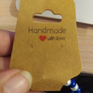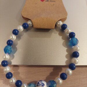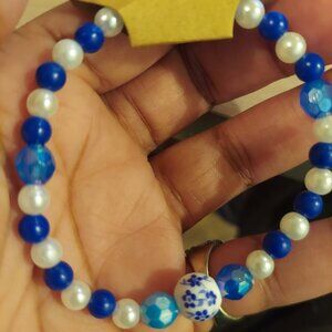 This handcrafted bracelet will be a great addition to a blue outfit or dress. It was created by Kay of Kayandkira and is approximately 9 inches. The mixture of hues of blue beads and use of 3 different sizes is a nice touch. The white bead with a floral design as a spacer gives it a sense of style and uniqueness.