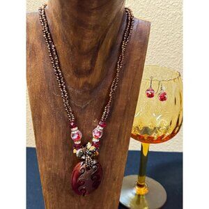 Handcrafted necklace and earrings set featuring glass beads and an intricate pendant.
