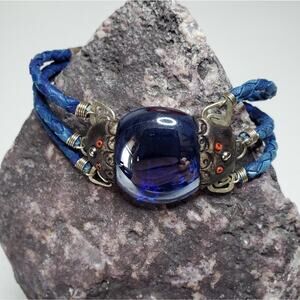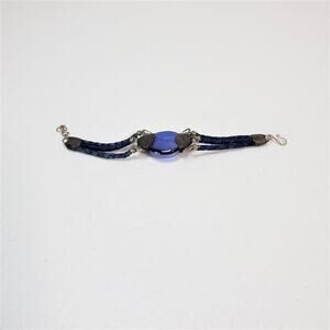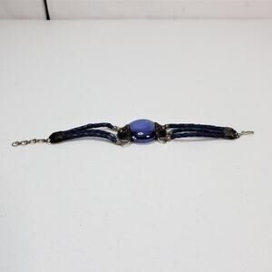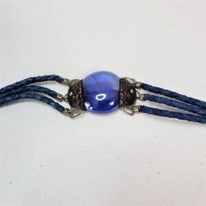 VTG: Handcrafted, boho festival charm is the artisan style of this unique three strap braided leather bracelet with an iridescent cabochon deep blue glass gem/folk art accents/silver tone hardware/adjustable chain link. In excellent pre-owned condition with no cracks or tears. **Disclosure: there are scuff marks on the glass gem. Please see pictures.