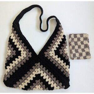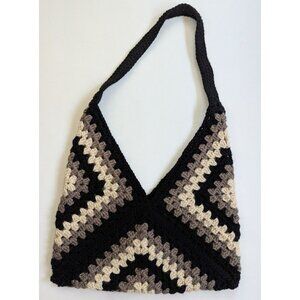Handcrafted Boho Crochet Shoulder Bag Granny Squares Brown Cream Black