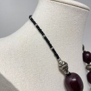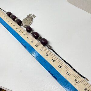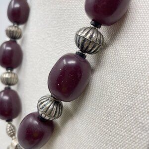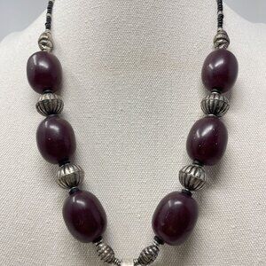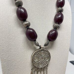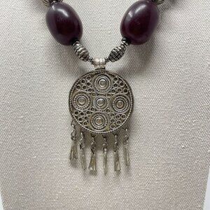 Stylish necklace featuring a silver-tone pendant and deep purple beads, adding an elegant boho touch to any outfit.