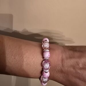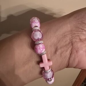 light pink and marble pink beaded bracelet with matching cross
