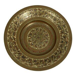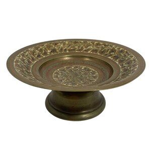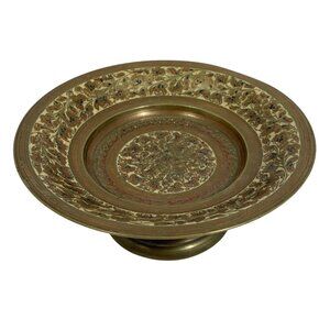 This handcrafted decorative pedestal plate features an intricate floral design, adding a touch of elegance to any setting. Its brass construction offers durability and timeless appeal.