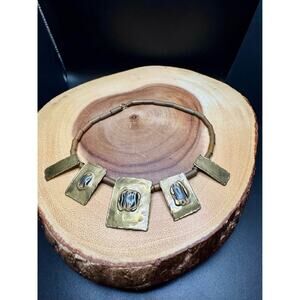 Unique artisan necklace featuring bold brass-tone square pendants with etched, wave-like center details. A sculptural, tribal-inspired piece with an earthy, modern feel. Lightweight and easy to style, this statement necklace is perfect for anyone who loves one-of-a-kind jewelry with a story.