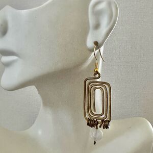 Add an artistic touch to your look with these handcrafted brass wire earrings featuring layered abstract rectangle shapes. The bold geometric design is complemented by a soft, faceted white bead at the base - possibly white jade or quartz — adding a subtle natural glow.
