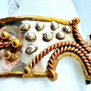 This intricately designed bracelet combines the warmth of bronze, the shine of copper, and the strength of zinc, accentuated by a genuine amethyst stone. The adjustable cuff ensures a comfortable fit, making it an elegant addition to any jewelry collection.