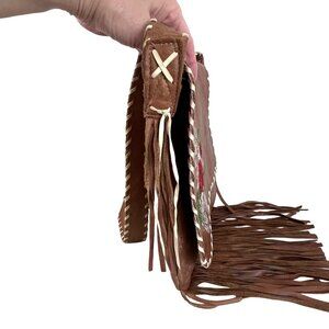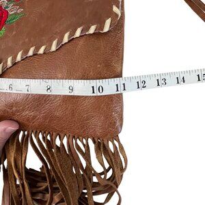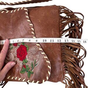 Handcrafted Brown Leather Crossbody Bag Red Rose Embroidery & Fringe Accents GUC