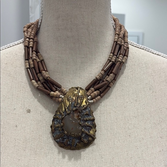 Handmade, multi-strand statement necklace with a tribal bohemian style, featuring natural materials like wood bone beads and a large organic-looking pendant. The pendant incorporates a rough stone with some metallic, gold-toned elements.
