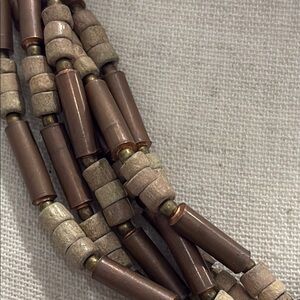 It has multiple strands (appearing to be four) of alternating longer and shorter tubular/rondelle beads that converge into a single large, irregularly shaped central pendant.