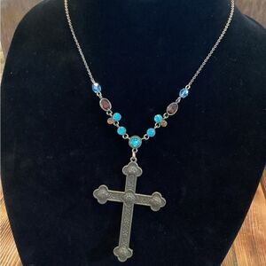New handcrafted with vintage materials, multi colored rhinestone and chain link necklace with large cross, see pics for measurements.