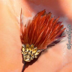 This stunning handcrafted brooch showcases vibrant burnt orange feathers arranged in an elegant and eye-catching design. The feathers radiate outward, creating a sense of movement and drama. At the base of the brooch, a cluster of sparkling rhinestones adds a touch of sophistication and brilliance, perfectly complementing the rich, warm tones of the feathers.