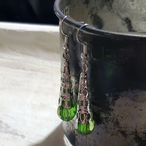 Handcrafted Caged Filigree Faceted Green Crystal Silver Teardrop Earrings