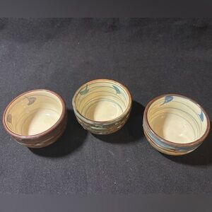 This is a lovely set of 3 small bowls that can be used for a variety of things. They are handmade pottery with a raised swirl pattern on the outside, each a little different but they all coordinate with each other. The inside of the bowls have a light cream color with a swirl and ginkgo leaf pattern.