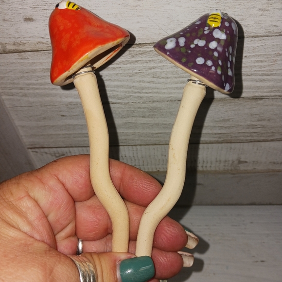Unique ceramic mushrooms with reddish orange and purple caps. Perfect for home decor. super cute to stick in flower pots