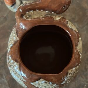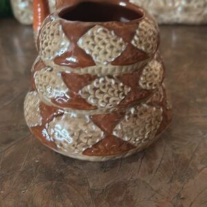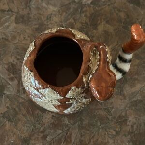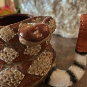 Enjoy your favorite beverage with this unique handcrafted ceramic rattlesnake mug. Featuring a striking brown and cream diamond back design with the addition of its tail as the mug holder. Curling up with itself and the protruding head as a great addition. This is a vintage piece and in excellent condition!! Forgot I had it until I was moving around stuff in the kitchen. Great gift for snake lovers 😊