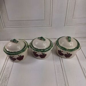 Set of three ceramic casserole/ crocs dishes. Features green Colors on the Dishes and red Apples design. Perfect for serving and storage. Pre- Owned in Beautiful Condition! Please See Pictures To See Actual Casseroles/Crocs And Condition also See Measurements! Please Reach Out With Any Questions! Have a Fabulous Day!