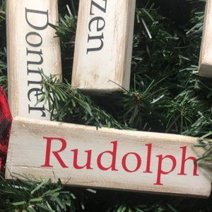 How different are these wood Christmas handmade reindeer ornaments?, perfect for your Holiday tree or just for decorations of your own ideas. These ornaments are made from wood 5" long by 11/16" wide and high. Wood - white chalk paint - ribbon - vinyl lettering. Set of 9. (As with any home décor item, care should be taken on hanging these on an outside area to prevent wear and tear from weather elements.)