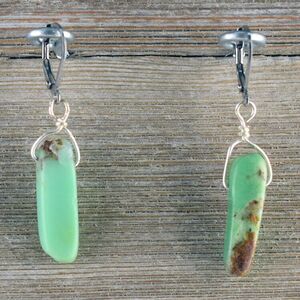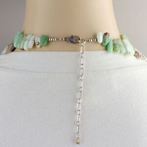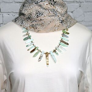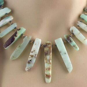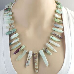 This necklace measures 24"-27 1/2" in length and made up of 5mm thru 60mm free form stick chrysoprase with twenty-six (26) 4mm Light Colorado Topaz Swarovski crystals placed throughout. The necklace has a lobster claw clasp and an extension chain. Bead caps/spacers lead free nickel free