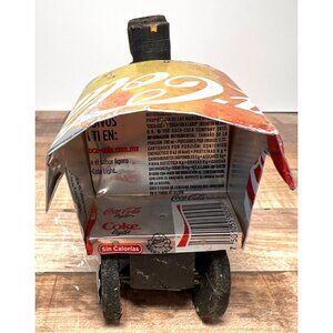 Handcrafted using Coca-Cola cans, highlighting some wear typical of recycled materials.