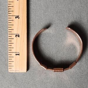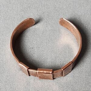 This vintage copper cuff bracelet features a geometric panel design and an open cuff style, making it adjustable for different wrist sizes. The patina adds to its vintage charm, giving it a rustic and timeless look.