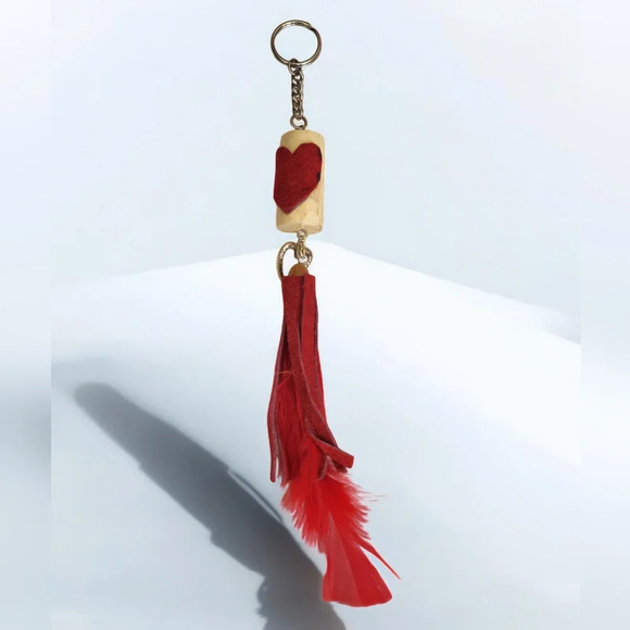 Handcrafted Cork Red Suede Heart Fringe Feather Heart Keychain