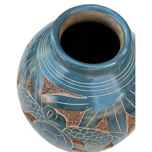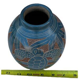 Handcrafted Costa Rican Turtle Design Blue & Terracotta Round Ceramic Vase 6" T