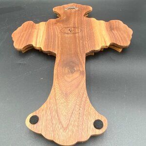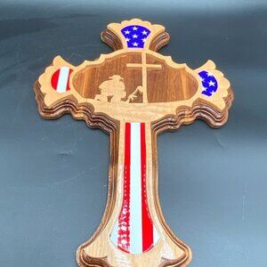 This handcrafted wooden cross is a beautiful memorial to fallen soldiers, featuring the American flag and handcrafted by Craig Caudill stamped on the back. Made in the United States, this wall hanging piece is a perfect addition to any collection of religious memorabilia or collectibles. The wood material adds a warm and natural touch to the design, and the handmade aspect makes it a unique and special item. Ideal for display in a home or office, this cross is a wonderful tribute to those who have served our country.