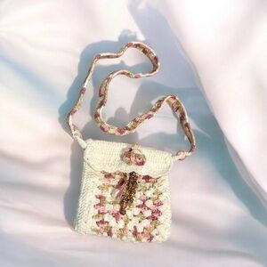 This elegant handcrafted crochet bag features a beautiful blend of cream and pink tones. Perfect for adding a touch of charm to any outfit.