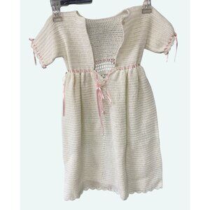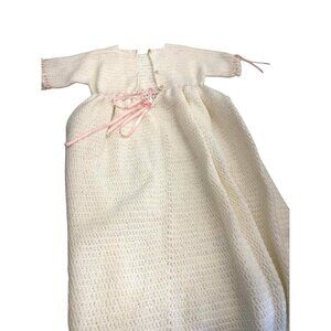 Handcrafted Crochet Baby Christening Gown With Pink Ribbon Accents - Soft Ivory