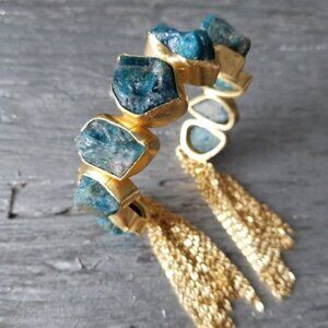 This Handcrafted cuff bracelet features, stunning rough cut semiprecious apatite stones embedded in recycled brass coated with dangling chain details to create a stunning natural look! Dainty