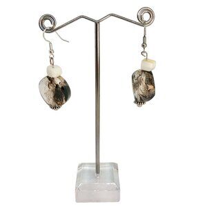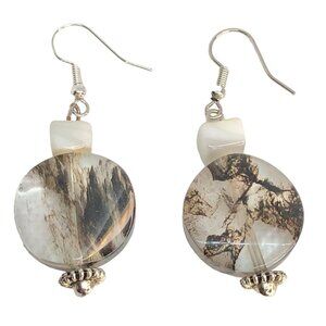These handcrafted earrings tell a story of nature’s beauty captured in glass. Their marbled design evokes serene landscapes, while white beads provide a soft contrast. Silver-tone accents add a timeless charm. A delicate yet bold accessory for those who appreciate artistic craftsmanship. Lightweight and comfortable for extended wear.