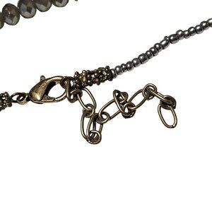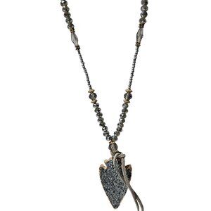 This handcrafted necklace features a natural druzy crystal arrowhead pendant with gold-tone edging, complemented by faceted gray crystal beads and silver seed beads. Decorative gold-tone spacers and clear crystal accents add elegant detail.