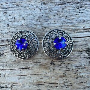 These are post pierced earrings with a blue Swarovski crystal and nickel free antiqued silver setting. My husband and I make jewelry using genuine Swarovski crystals. All items are new and much prettier in person than in pictures. Proceeds used to help our five-year-old granddaughter Lila May in her fight against cancer, but she lost her battle. A percentage of profit will go to neuroblastoma charities. #439