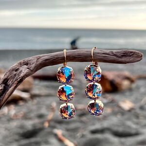 Handcrafted earrings with beautiful Swarovski rivoli crystal that is golden in the undertones, and has a blue shimmer coating on a gold tone leverback pierced earring. My husband and I make jewelry using genuine Swarovski crystals. All items are new and much prettier in person. Proceeds used to help our five-year-old granddaughter Lila May in her fight against cancer, but she lost her battle. A percentage of profits will go to neuroblastoma cancer finding a cure charities. 323