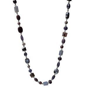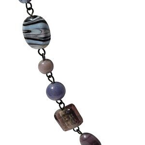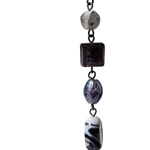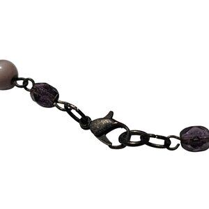This handcrafted necklace features a variety of glass beads in purples and blacks. Its adjustable length and lobster clasp ensure a secure fit.