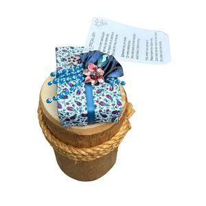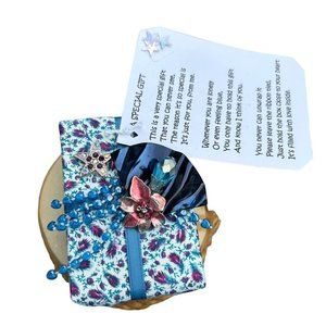 This Embellished, Handcrafted Fabric Gift Box is New and in excellent condition. The box is empty with a "Gift of Love" inside and has a card attached with a verse to explain the meaning of this gift. The top of each fabric wrapped box is embellished with pieces of jewelry - most pieces are Vintage. The perfect little memento to give a friend. The fabric is cream, purple, lavender, and green. The box measures 3" L x 2.50" W x 1" H.