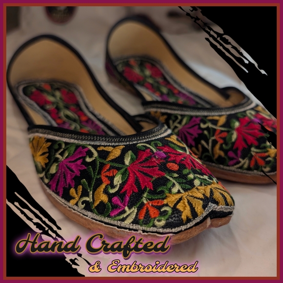 Punjabi Jutti flat slip on sandal. Experience elegance with these handcrafted embroidered women's shoes. Featuring vibrant colors, they add a unique touch to any outfit.