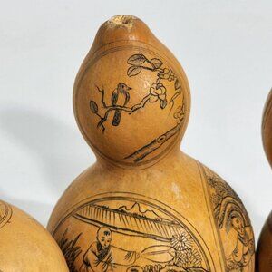 These vintage calabash gourds, adorned with intricate hand-etched scenes and Chinese calligraphy, serve as a testament to skilled artistry and cultural heritage. The natural tones and unique designs evoke a sense of nostalgia, making them ideal as decorative pieces or collectibles that celebrate traditional craftsmanship.