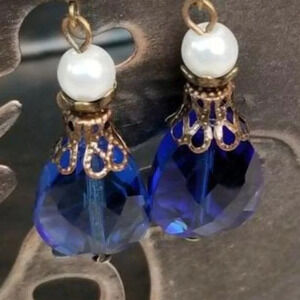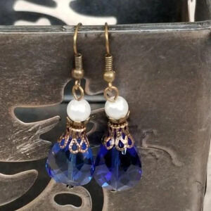 Handmade Steampunk Blue Faceted Glass Teardrop Antiqued Brass Dangle Earrings